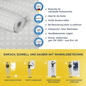 Der Untergrund muss eben, glatt und frei von Fett und Trennmitteln sein und darf nicht saugfähig sein. Vor dem Aufkleben der Fototapete muss der Untergrund und die Qualität des Druckes geprüft werden.